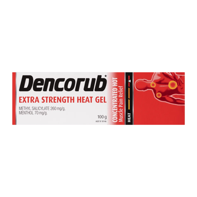 For those who want to rub a little extra heat into their muscles, try Dencorub* Extra Strength Heat Gel.Dencorub Extra Strength Heat Gel contains 26% methyl salicylate, which makes it a concentrated hot formula that gives hours of relief from pain resulting from sprains, strains, painful joints, muscular aches and pains, as well as Arthritis, Rheumatism, Lumbago and Fibrositis. The clear gel formulation allows for faster penetration and relief.