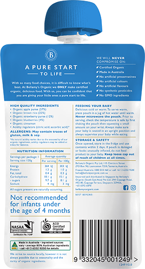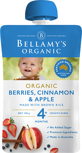 Bellamy's Organic Berries, Cinnamon and Apple with Brown rice is a yummy and convenient way to introduce a combination of fruit tastes, complimented with the natural spice of cinnamon. Not just delicious, the added brown rice provides the goodness of wholegrains to every pouch.