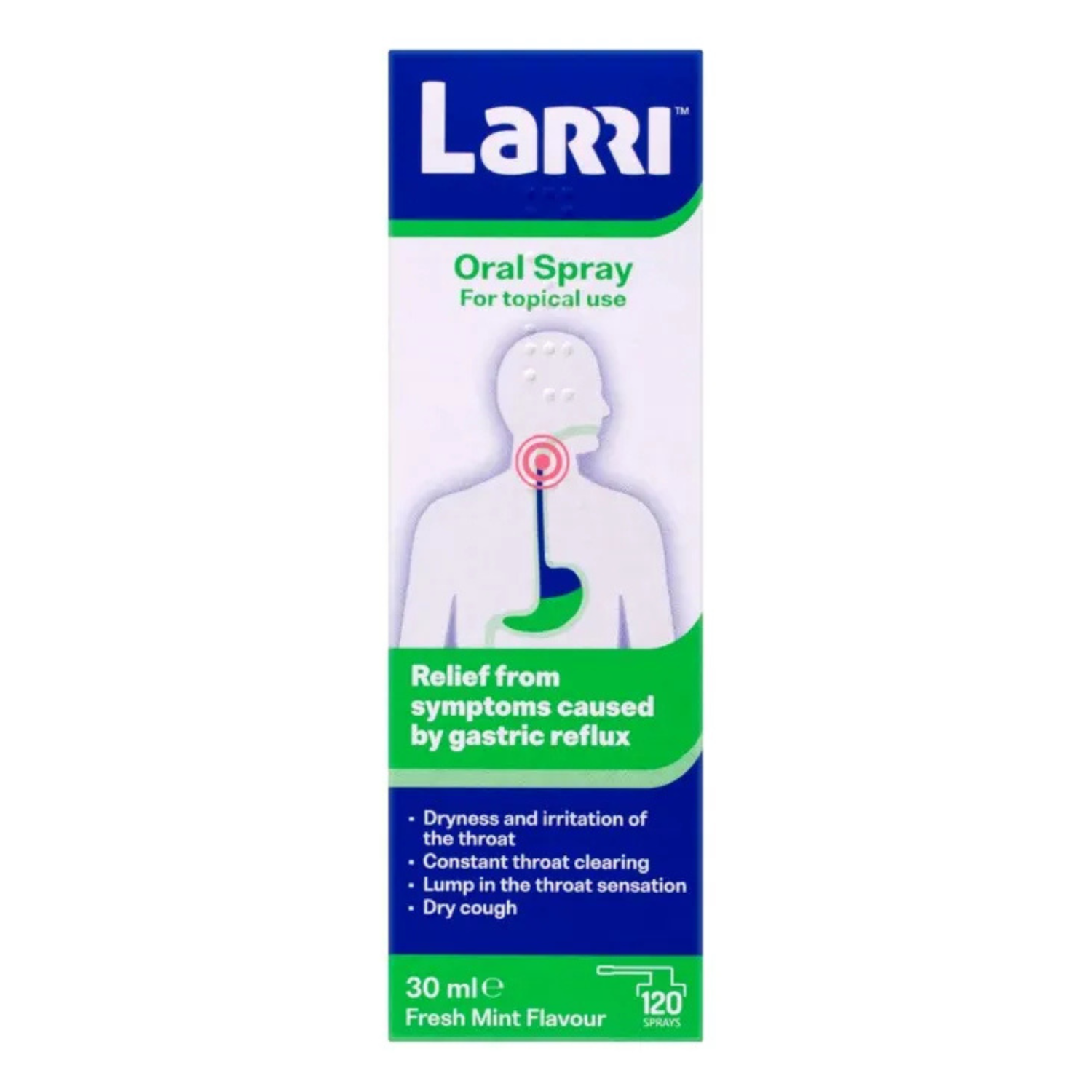 Larri オーラルスプレーは、喉と上部食道 (食物の通り道) の組織を潤滑してコーティングし、胃酸や酵素が胃から逆流した場合にこれらの組織と接触するのを防ぐことで、胃逆流の症状を軽減します。