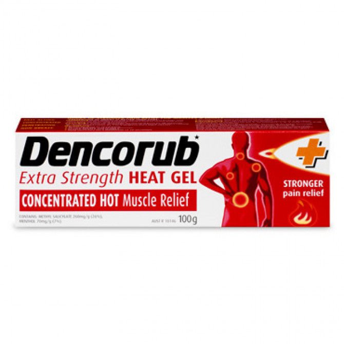 For those who want to rub a little extra heat into their muscles, try Dencorub* Extra Strength Heat Gel.Dencorub Extra Strength Heat Gel contains 26% methyl salicylate, which makes it a concentrated hot formula that gives hours of relief from pain resulting from sprains, strains, painful joints, muscular aches and pains, as well as Arthritis, Rheumatism, Lumbago and Fibrositis. The clear gel formulation allows for faster penetration and relief.