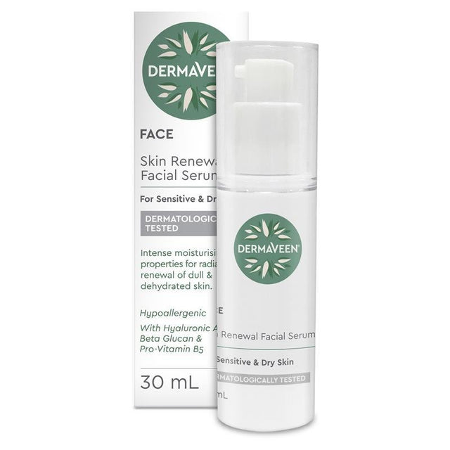 Created by nature proven by science. DermaVeen Skin Renewal Facial Serum is formulated with natural Colloidal Oatmeal to nourish and renew dry & sensitive skin.Enriched with Hyaluronic Acid, Pro-Vitamin B5 and Betaglucan to provide intense hydration.