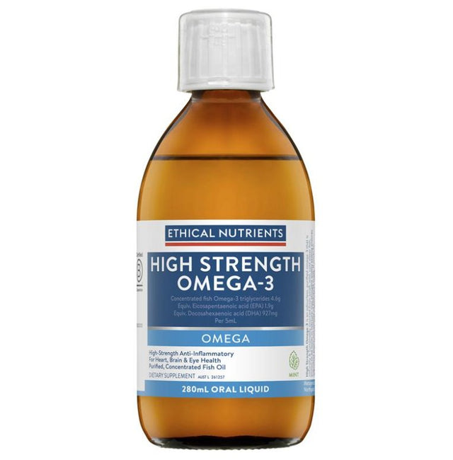 Ethical Nutrients High Strength Omega-3 is a quality liquid fish oil for anti-inflammatory relief and support a healthy heart, eyes & brain function. Odourless & available in fresh mint.