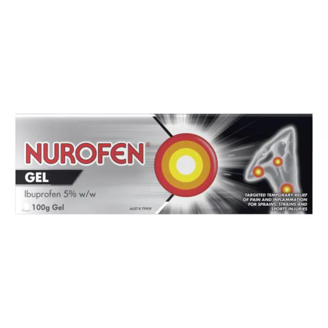 - Nurofen Gel is gently rubbed into the skin of the affected area, for the temporary relief of pain and inflammation associated with acute soft tissue injuries including sprains, strains and sports injuries.