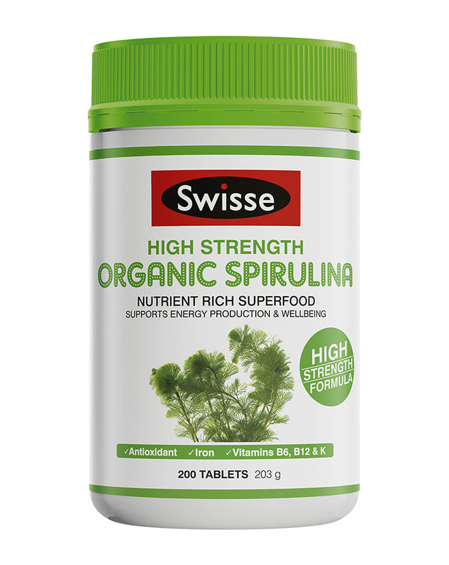 Swisse High Strength Organic Spirulina is a premium quality formula containing organic spirulina, a green superfood that provides a natural source of vitamins, minerals and antioxidants to support normal energy production, immune function, bone structure and a healthy nervous system.