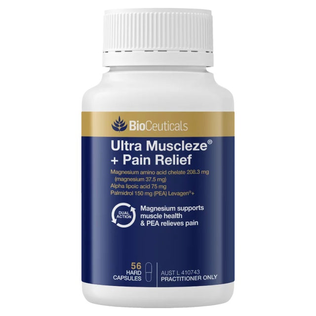 BioCeuticals® Ultra Muscleze® + Pain Relief contains UltraMag® magnesium, bioavailable PEA (Levagen®+) and alpha lipoic acid (ALA). PEA (palmitoylethanolamide also known as palmidrol) is a fatty molecule that is naturally produced by the body in response to pain and inflammation. ALA is an antioxidant which reduces free radicals formed in the body. UltraMag® is a specialised blend of readily available magnesium amino acid chelate. Levagen®+ ultilises LipiSperse® technology, which may improve the absorption of its PEA by up to 70% when compared to standard Levagen® PEA.